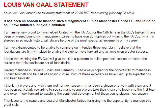A "very disappointed" Louis van Gaal has issued the following statement.